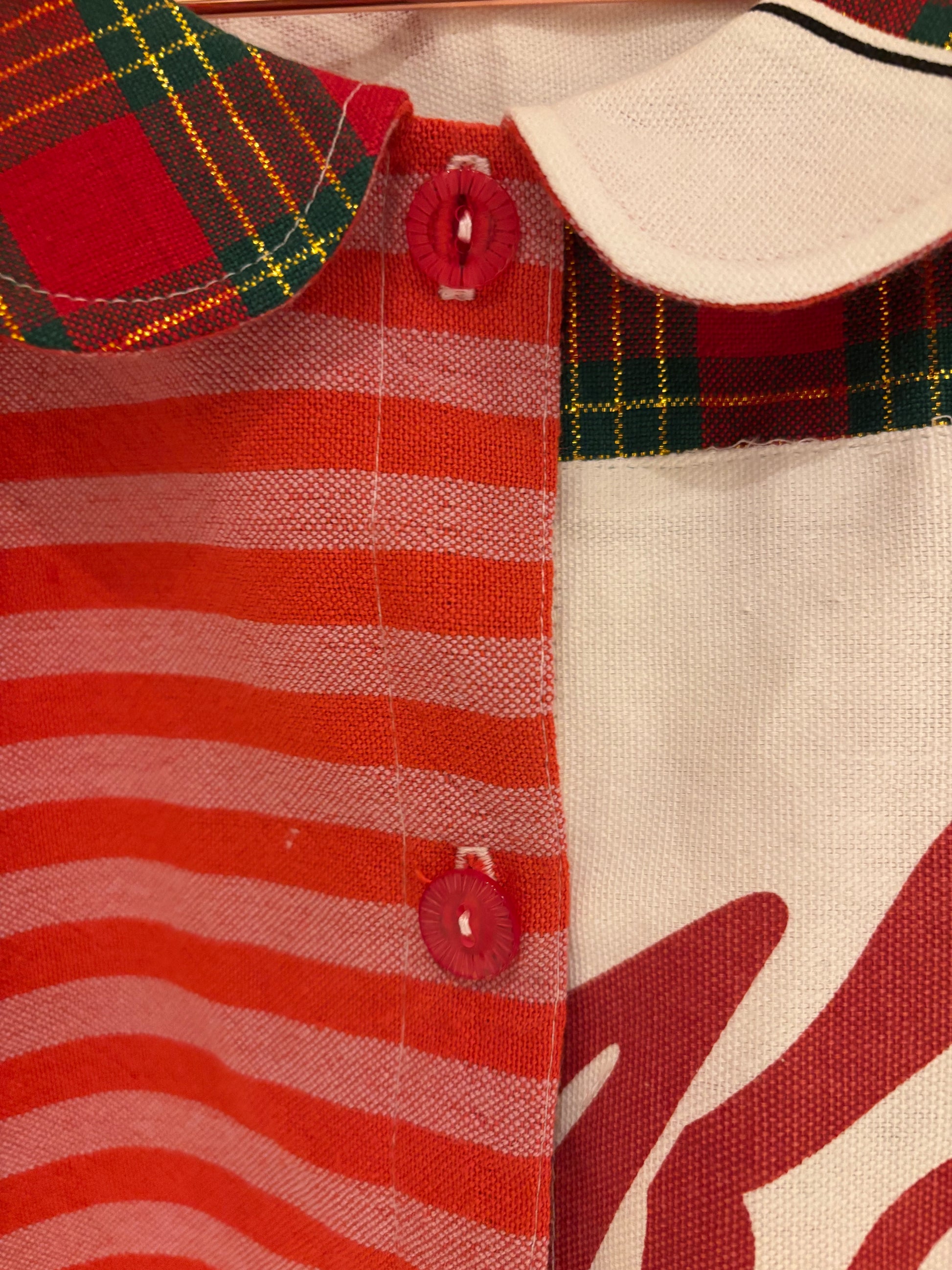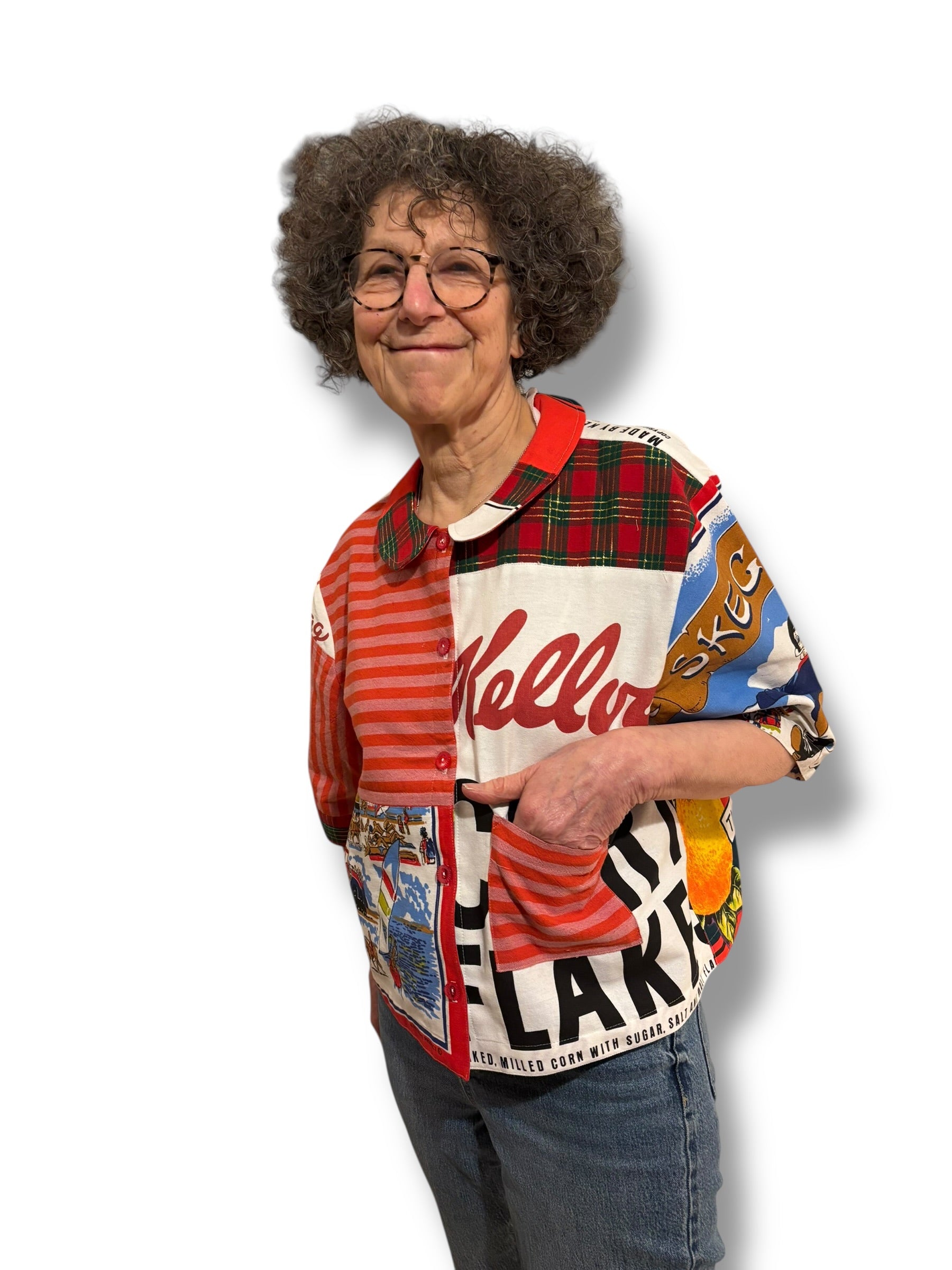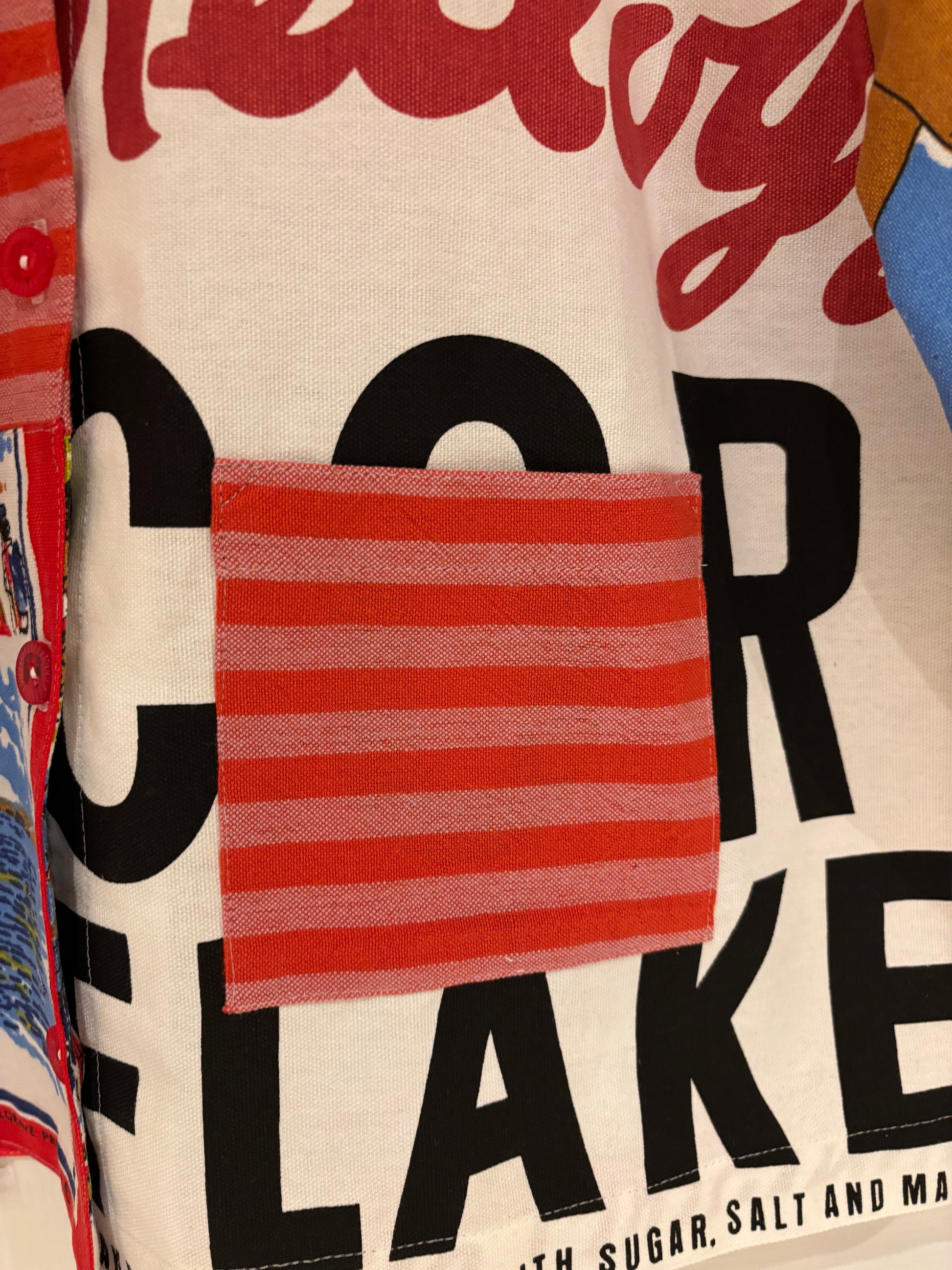 Kellogg’s meets Golden Shred. Seaside scenes collide with citrus brights. Stripes, slogans, and pantry pride — all stitched into one gloriously offbeat, cropped silhouette with a perfectly prim Peter Pan collar.